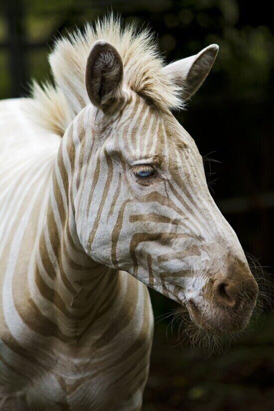 Zoe, a única ''Zebra albina'' restante na Terra. Ela tem olhos azuis e listras douradas.